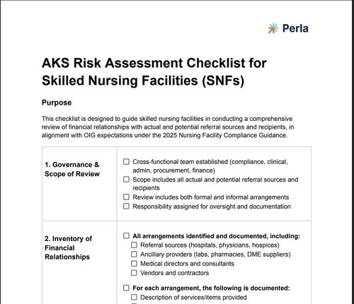 Download the SNF AKS Risk Assessment Toolkit, including a practical checklist and Excel tracker to evaluate referral relationships, ensure safe harbor compliance, and align with OIG guidance.